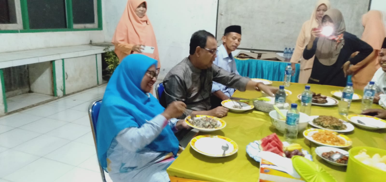 Kami segenap civitas akademika menunggu sejak sore kedatangan ini, kunjungan ini terasa spesial, karena ini adalah kali pertama beliau menyambangi sekolah kami. Ketika tiba di sekolah, kepala dinas beserta rombongan yang terdiri dari koordinator pengawas, ketua MKKS SMA, dan beberapa kepala sekolah sekota dan kabupaten Bima dijamu dengan makan malam bersama dengan menu yang antara lain makanan khas bima, mangge mada di ruangan yang telah disiapkan oleh Ibu-Ibu guru dan pengurus dharma wanita ranting SMAN 1 Wawo. Enak ayam kampungnya, demikian celoteh ketua MKKS, Muhammad Nur.